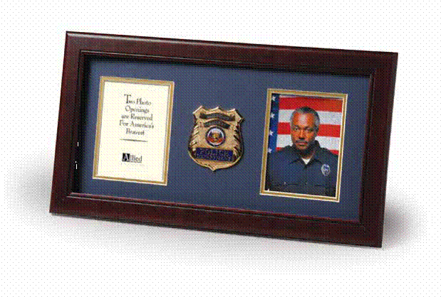 These solid wood frames proudly display the cherished photos and achievements of our local heroes. Each frame exhibits a die-cast, gold-plated medallion atop a beveled-cut mat. Mahogany colored wood. Desktop easel and wall mounting hardware included. Made in U.S.A.