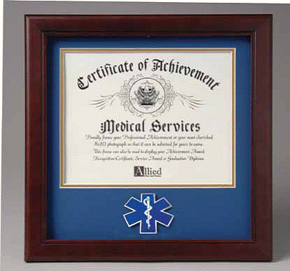 Proudly frame your professional achievement or your most cherished 8" x 10" photograph. Each frame exhibits a die-cast, gold plated medallion atop a bevel-cut, double-matted solid mahogany colored wood frame. Desktop easel and wall mounting hardware included. Made in U.S.A. Outside dimensions: 14" x 14"
